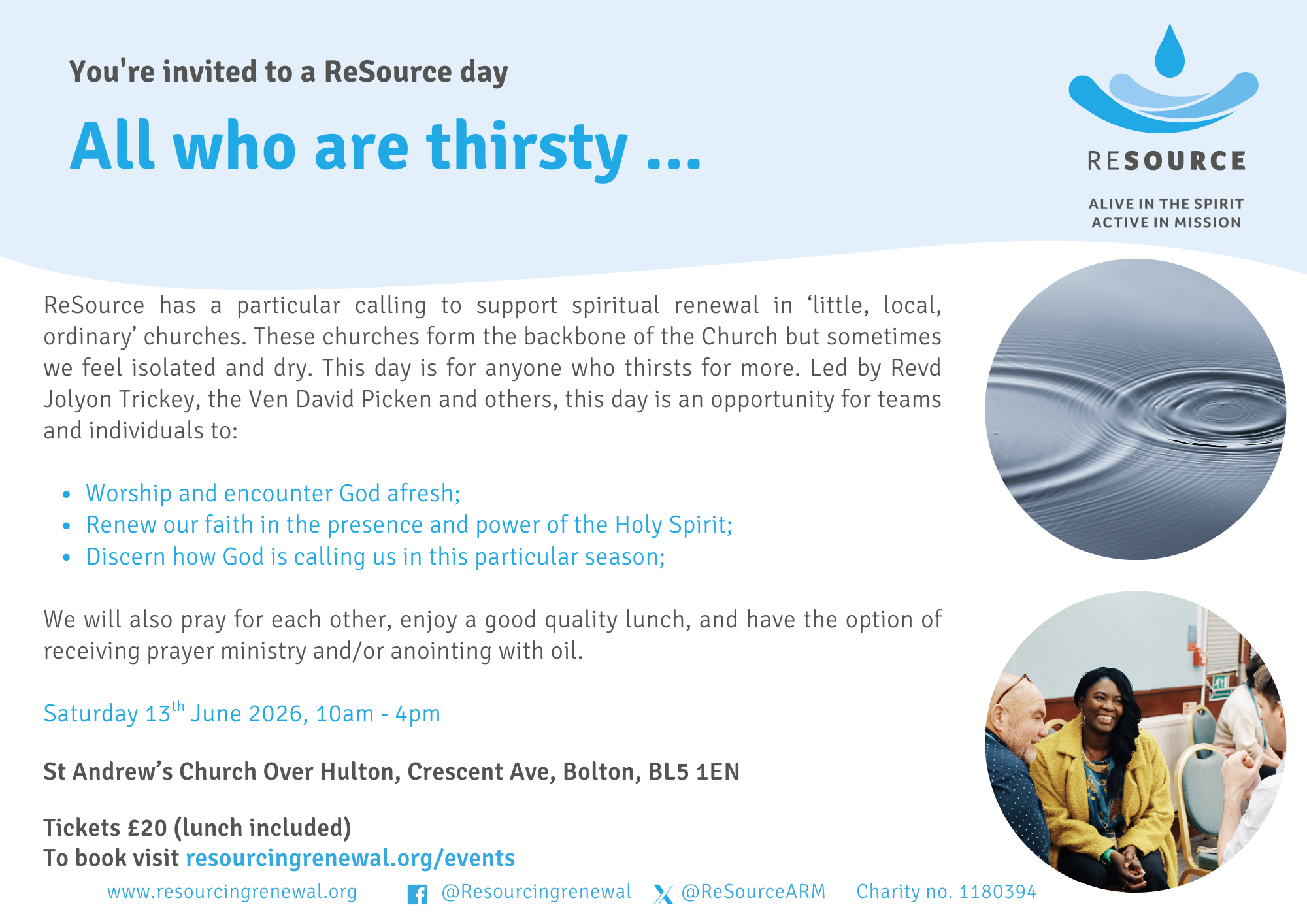 Join ReSource at Holy Trinity on Saturday 25th April. We will worship and encounter God afresh, renew our faith in the presence and power of the Holy Spirit and discern how God is calling us in this particular season. We will also pray for each other, enjoy a good quality lunch and have the option of receiving prayer ministry and/or anointing with oil. This day will be led by the Revd Jolyon Trickey, the Ven Mones Farah and others. Book your tickets below.