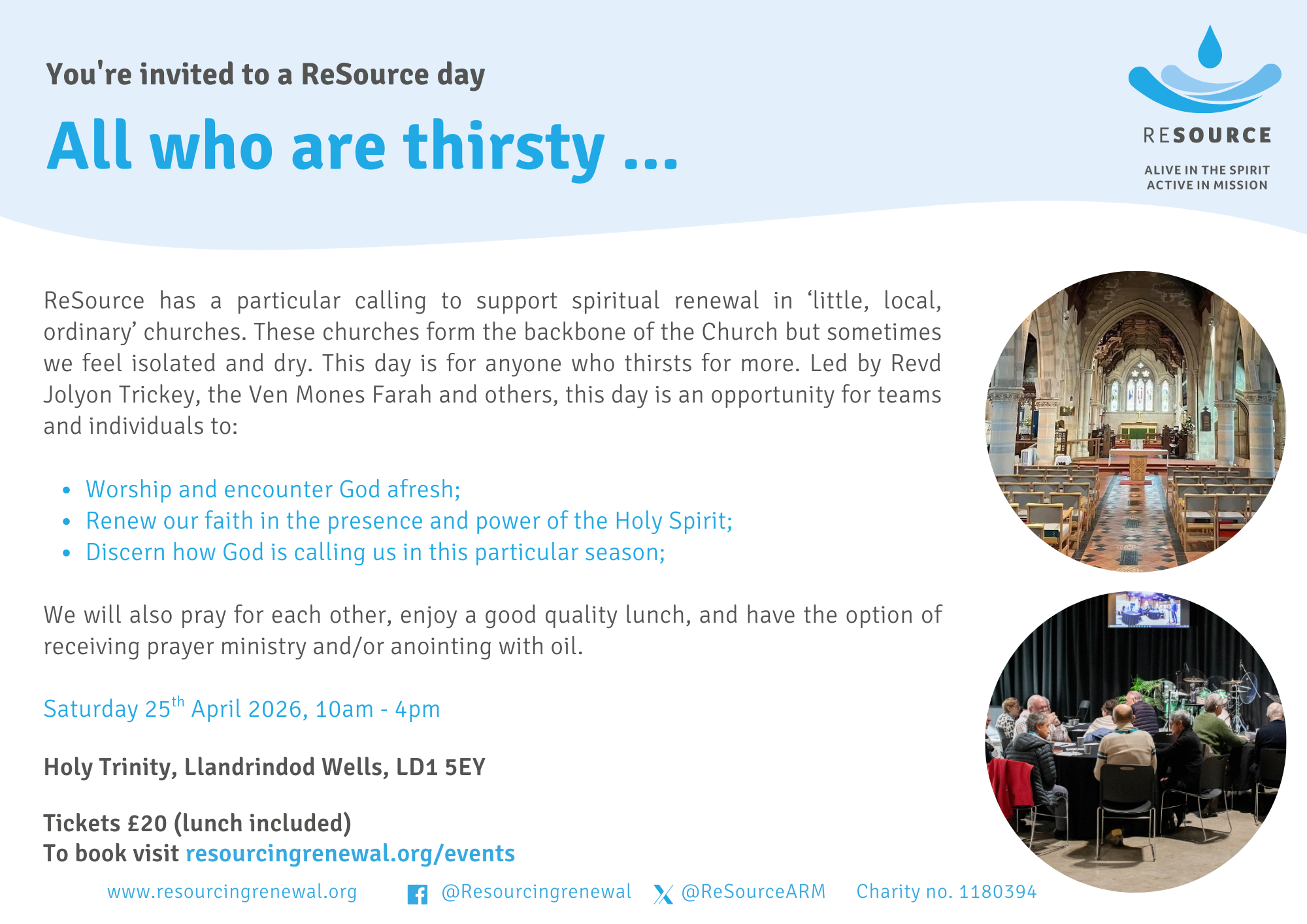 Join ReSource at Holy Trinity on Saturday 25th April. We will encounter God afresh, renew our faith and discern how God is calling us in this particular season. We will also have times to worship and to reflect. This day will be led by the Revd Jolyon Trickey, the Ven Mones Farah and others. Book your tickets below.