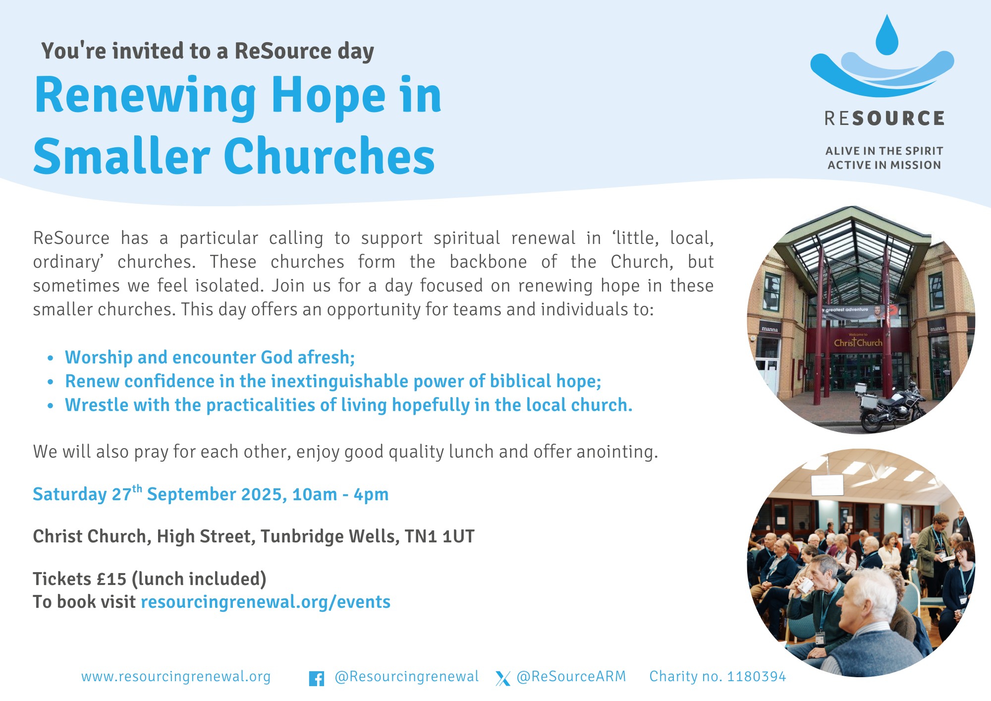 Join ReSource at Christ Church Tunbridge Wells on Saturday 27th September for a day focussed on renewing hope in ‘little, local, ordinary’ contexts. We will encounter God afresh, renewing our confidence in the inextinguishable power of biblical hope. We will also have time to worship, reflect, wrestle together with the practicalities of living hopefully in smaller churches.